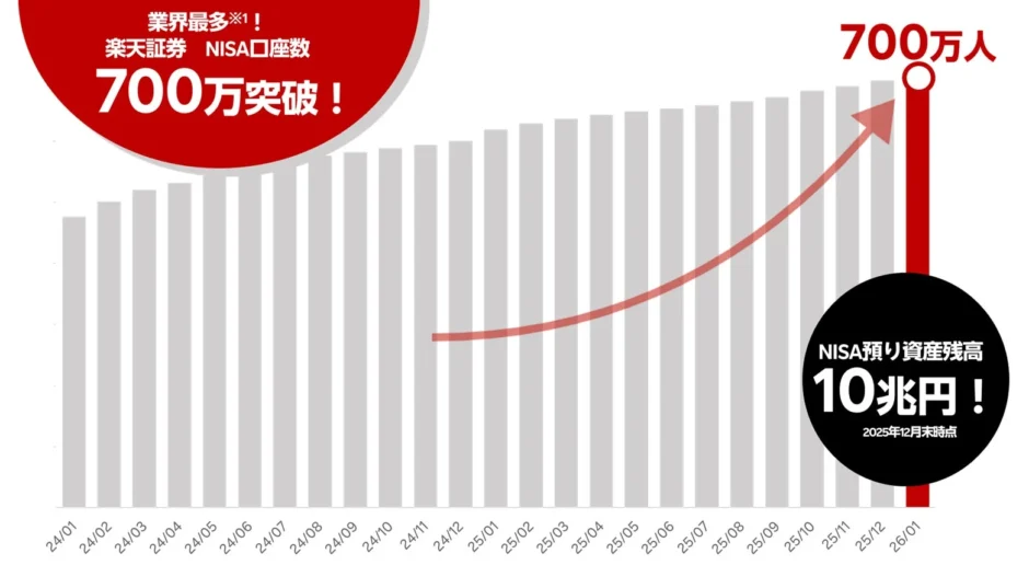 楽天証券は、2026年1月にNISA(ニーサ:少額投資非課税制度)の口座数が業界最多の700万口座を、2025年12月末に新NISAの預かり資産残高が10兆円を突破したことを発表しました。これは、多くの投資家が楽天証券のNISAを選んでいることを示しています。