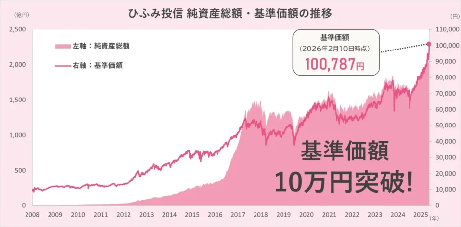 主に日本の成長企業に投資する「ひふみ投信」の基準価額が、2026年2月10日付で10万円を突破しました。