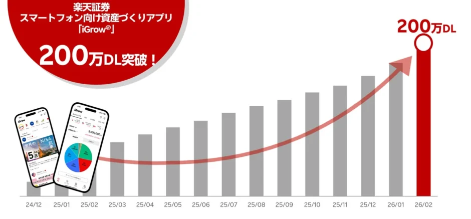 楽天証券が提供するスマートフォン向け資産づくりアプリ「iGrow®」が、2026年2月に累計200万ダウンロードを突破しました。2025年6月に100万ダウンロードを達成してから、わずか約8カ月でさらに100万ダウンロードを積み重ねた形です。この急速な広がりは、多くのユーザーが「iGrow®」の利便性や機能を高く評価していることを示しています。